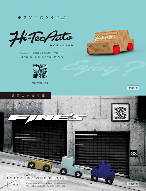 今日も「USDM RULEZ No.1」です。お題の広告は福岡のお店2件の合同1ページ広告となっております。可愛らしい雰囲気の広告上では具体的なことには触れられておりませんので、各ウェブサイトでご確認くださいね。PDFには各QRコードの部分に各ウェブサイトへのリンクボタンを仕込んでおりますので、クリックで行けます。