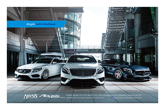 で、アビスオートブティックの広告ビジュアルですが、カッコイイですね〜。ギリギリまで下げた車高にハマるアルミがキマってます。