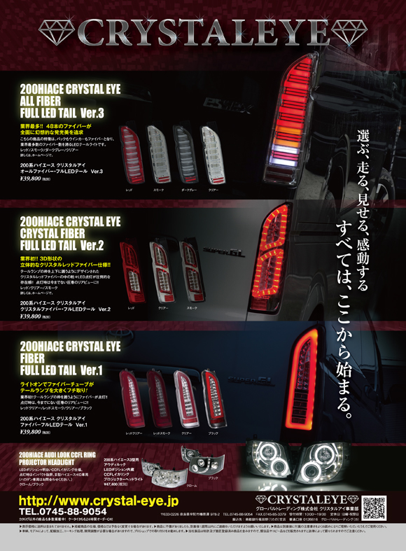 LEDやファイバーを使ったテールランプ等が大人気のクリスタルアイ。ハイエース本のための広告なので、ハイエース用のアイテムを厳選して載せています。テールランプだけで3種類あるんですね。人気車種はイイですねぇ〜